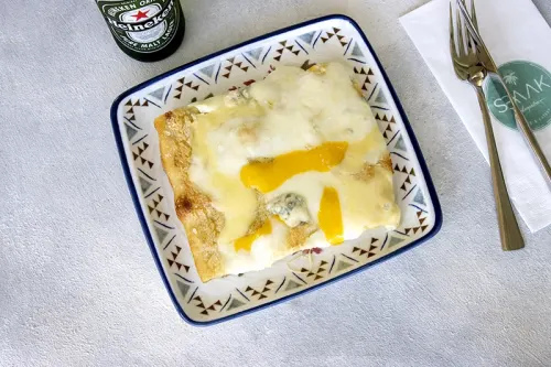 Смешанный сырный соус с маскарпоне и рикоттой, Фиор ди латте, грибная смесь, соус песто с базиликом.
