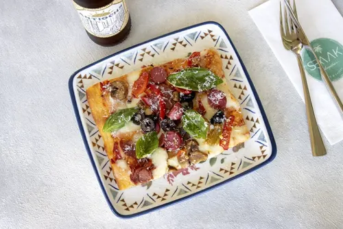 Соус Сан Марцано из помидоров, грибы, перец, суджук, оливки, моцарелла, вишневидные помидоры, пармезанский сыр.